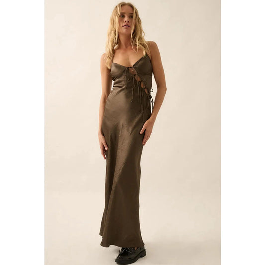 Satin Bias-Cut Tie-Front Cutout Maxi Slip Dress in Sage Brown