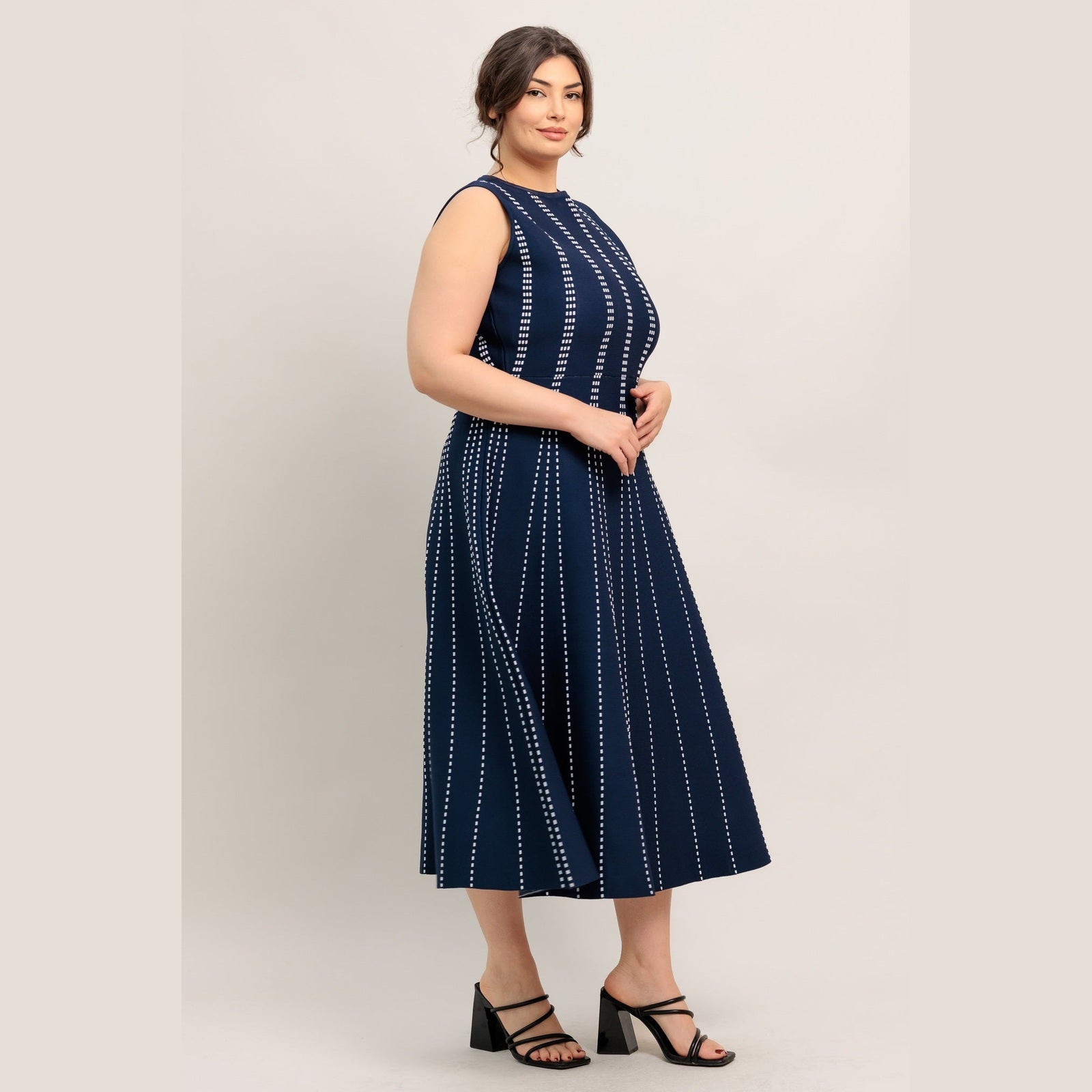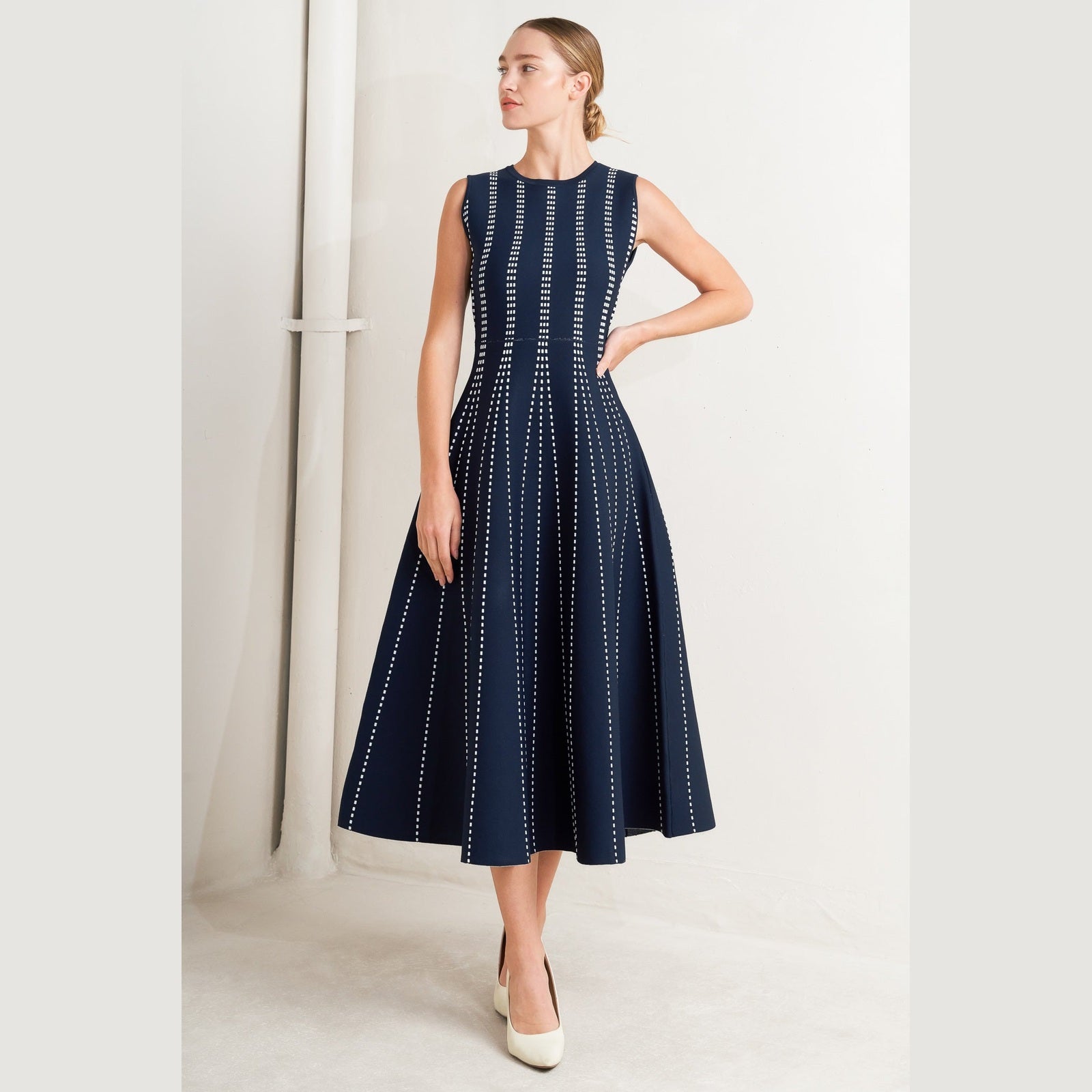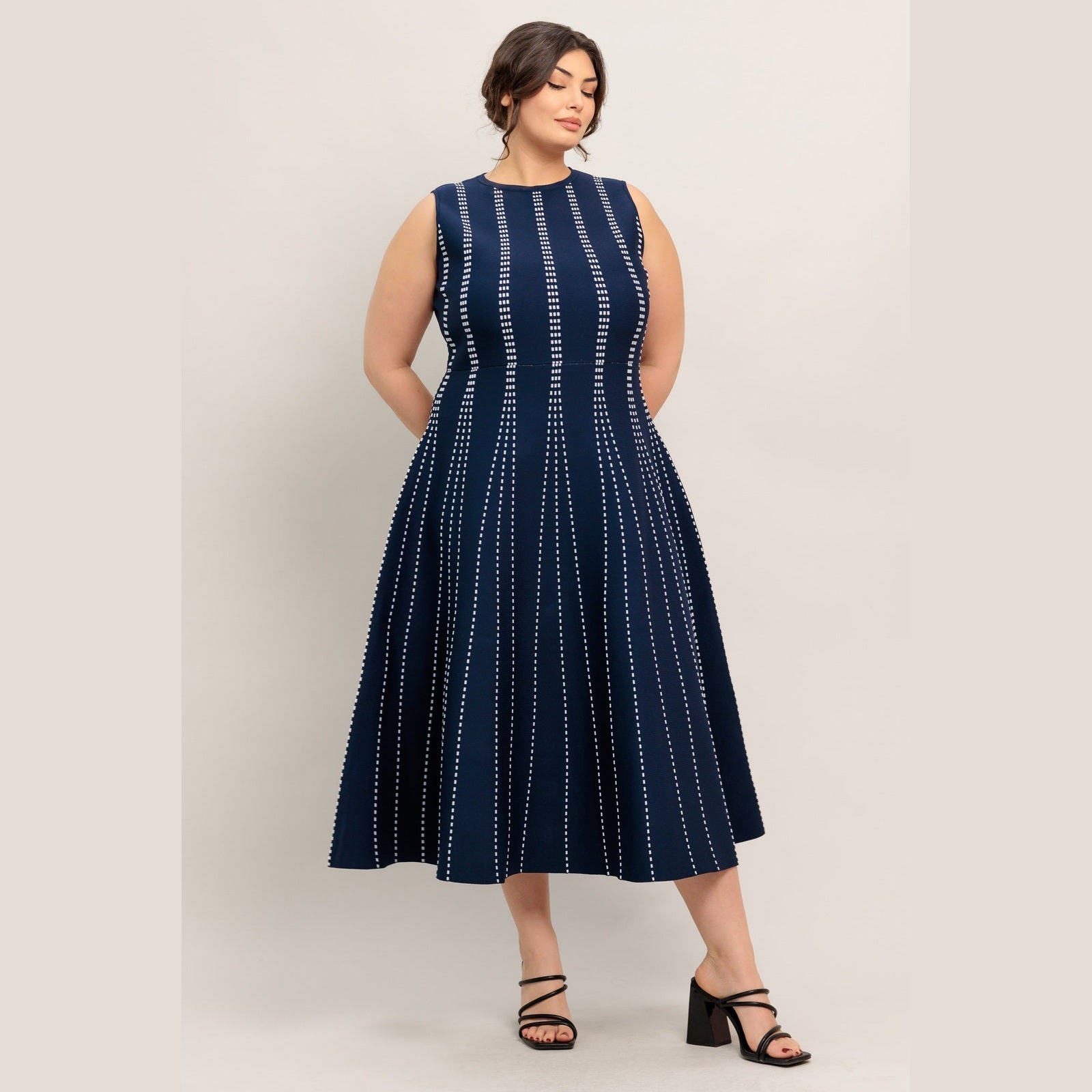 A jacquard sweater knit midi dress featuring round neckline, sleeveless and circle skirt