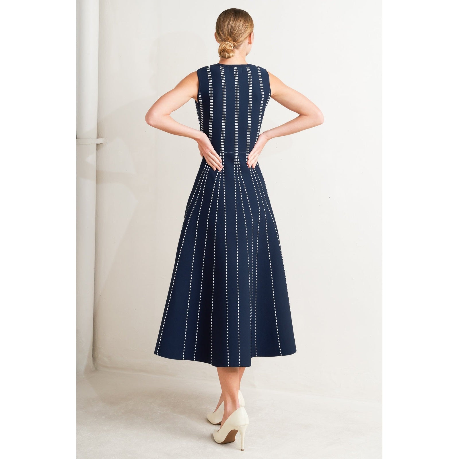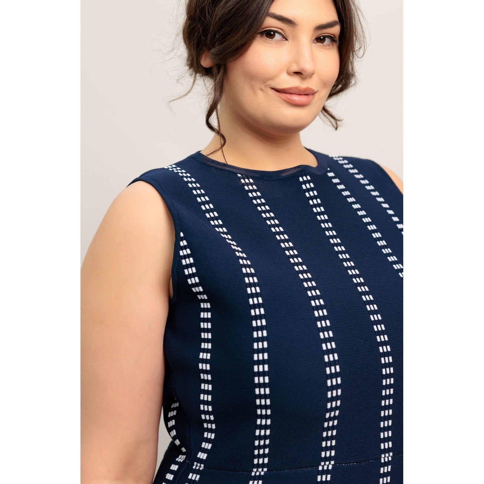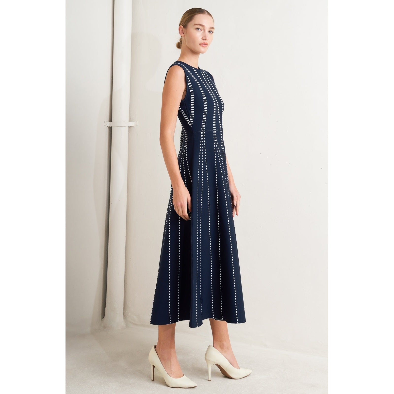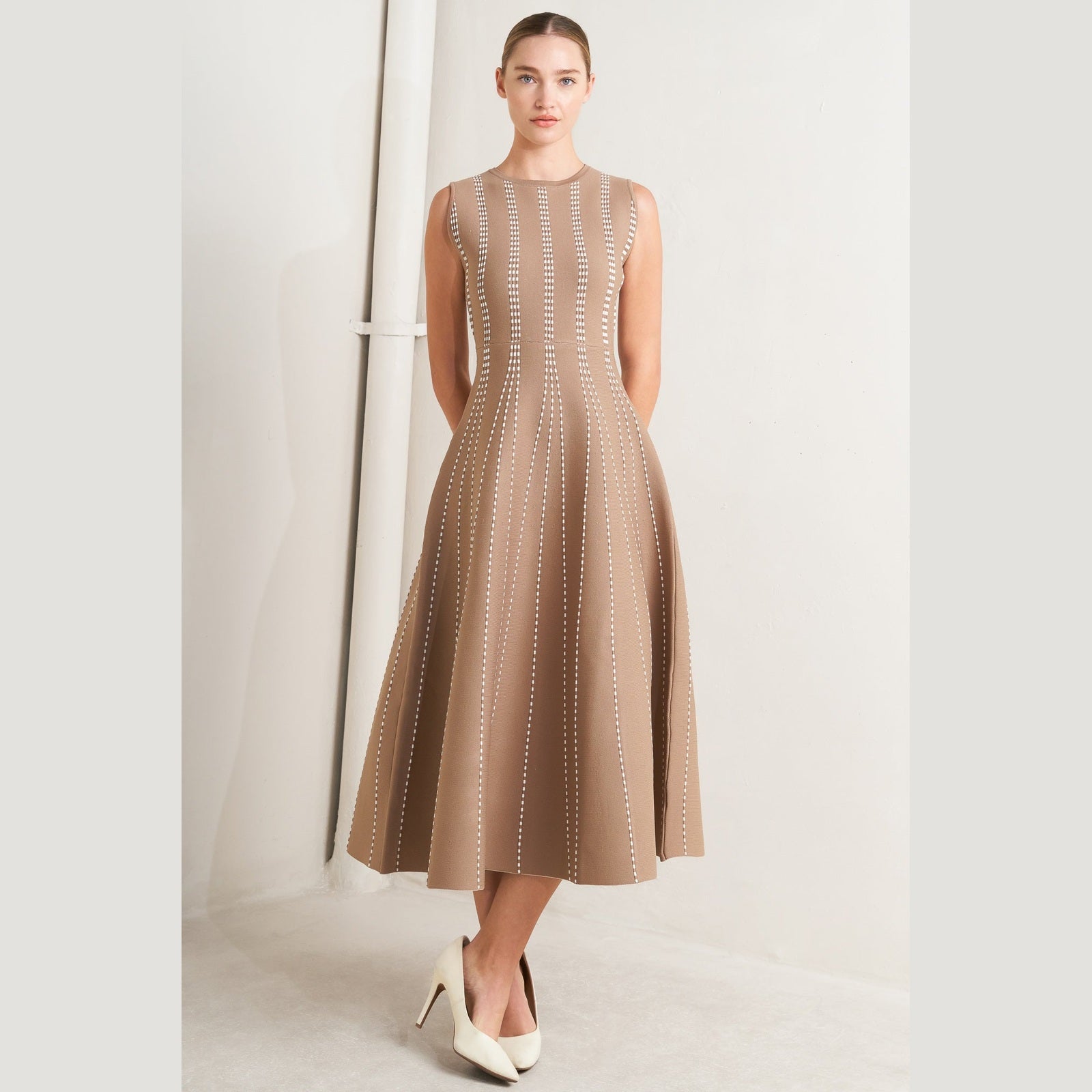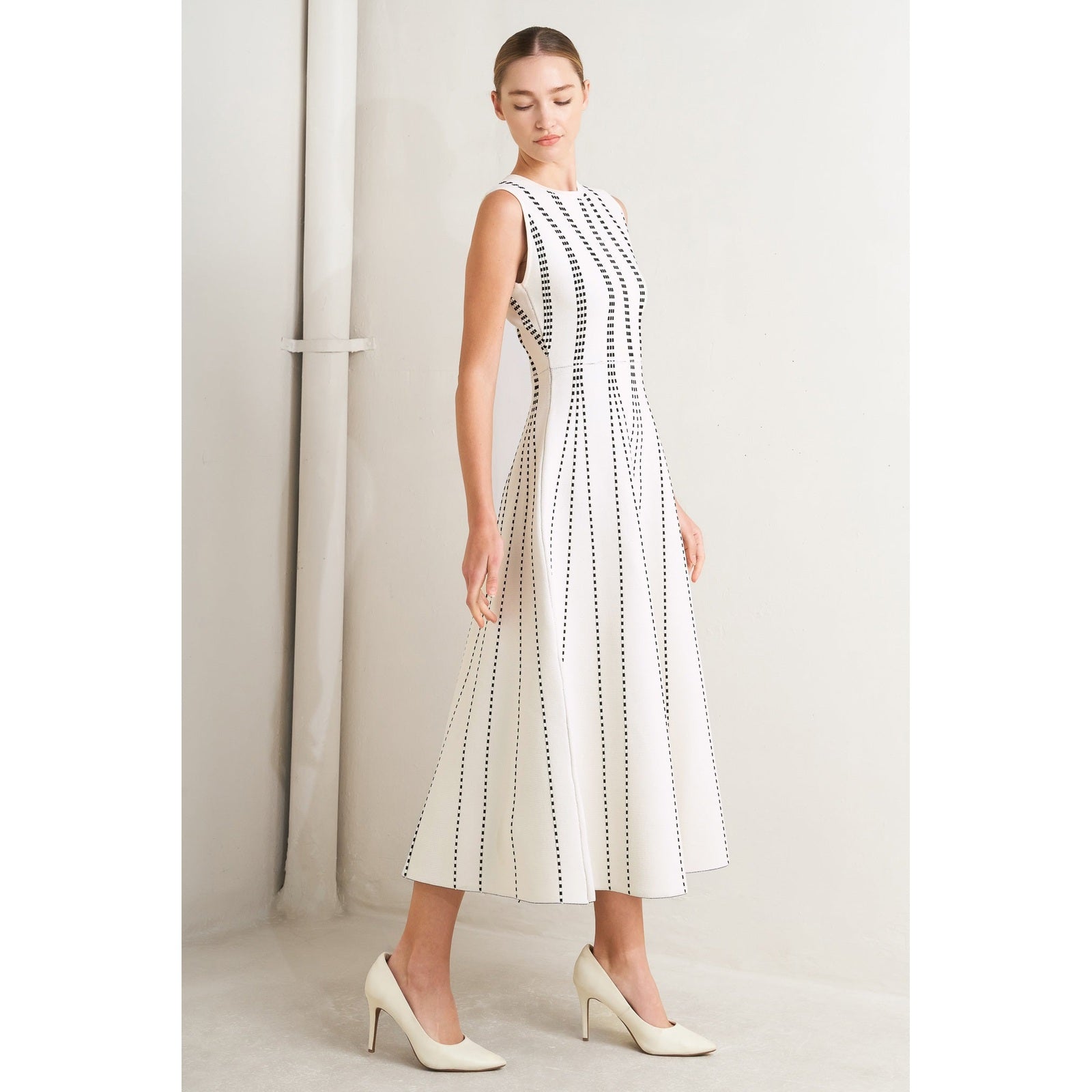 PERFECTLY POISED JACQUARD SLEEVELESS SWEATER MIDI DRESS in Mocha/White - Navy/White - White/Black. Website exclusive · Ships direct!