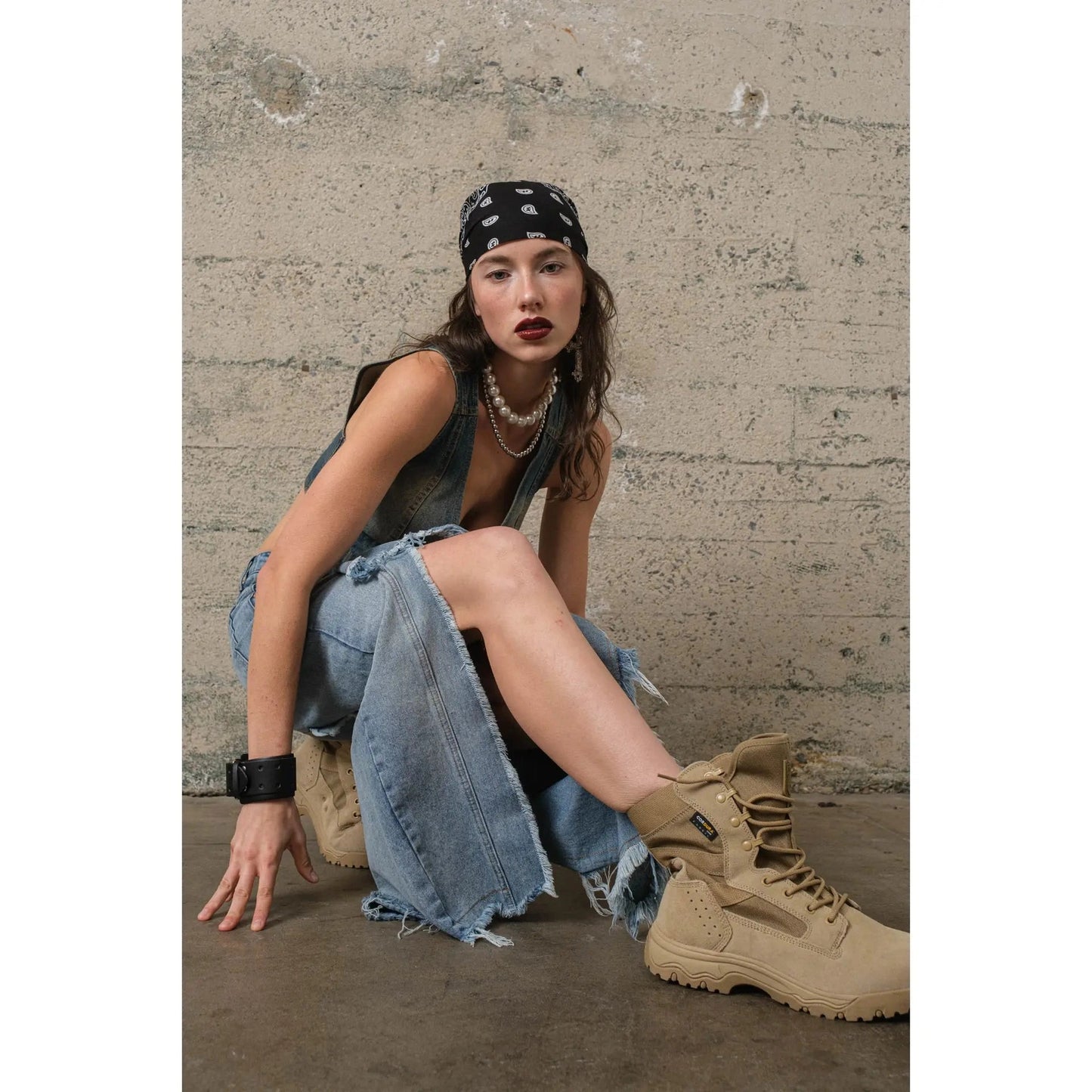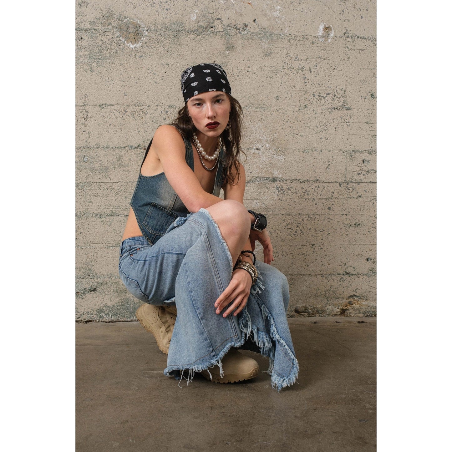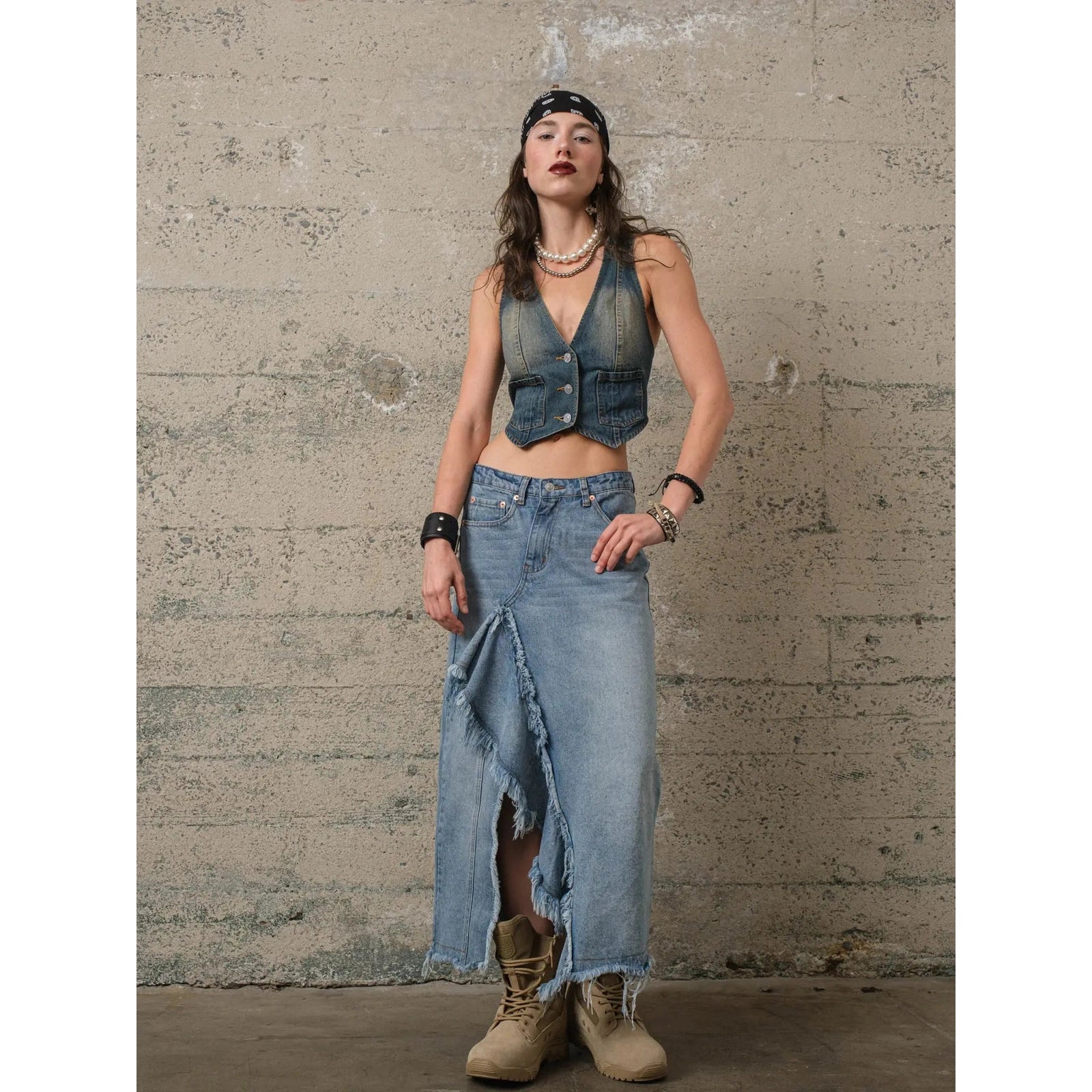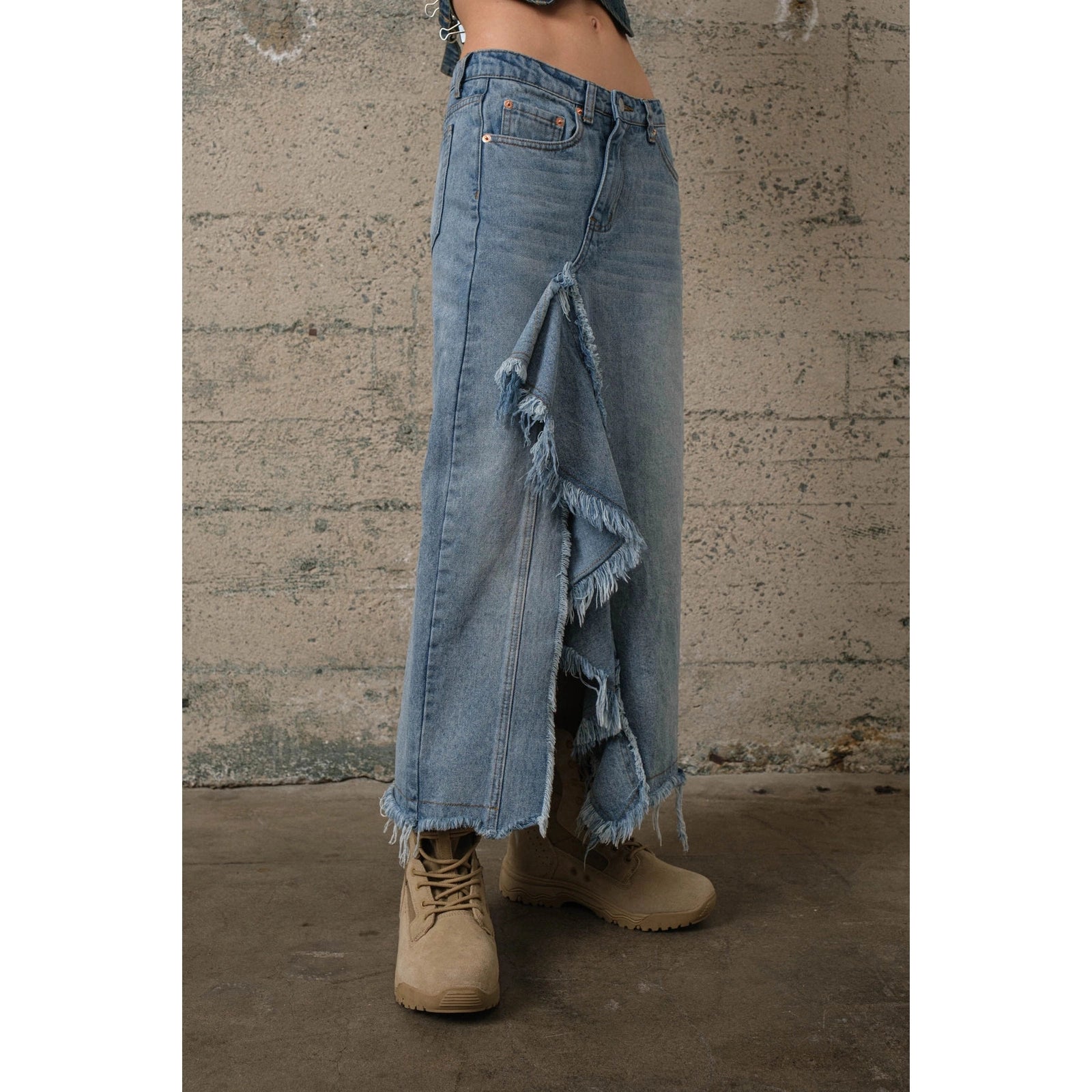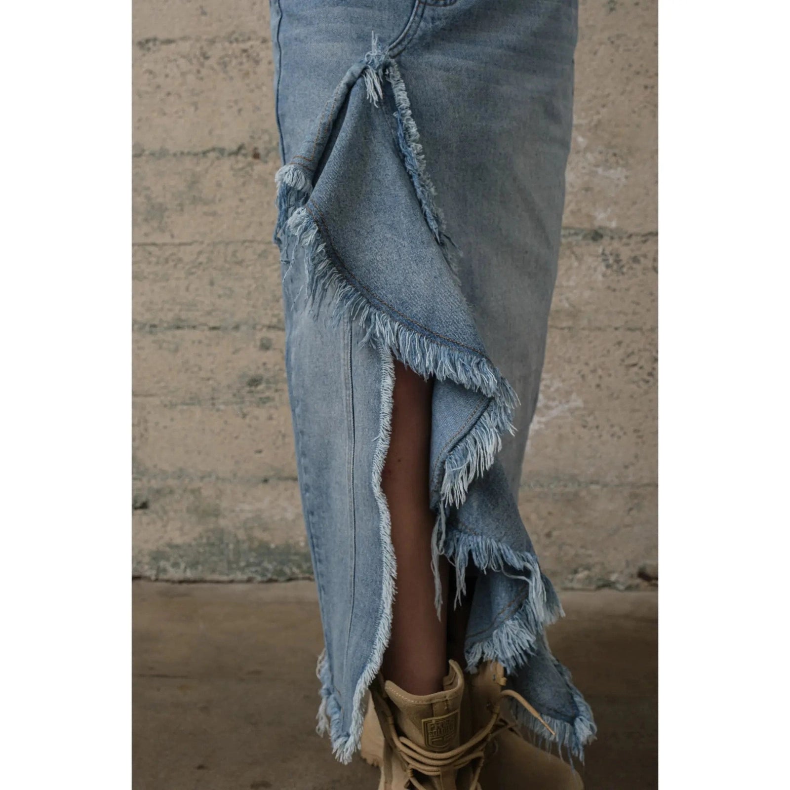 Front Slit Ruffle Denim Maxi Skirt in Medium Wash