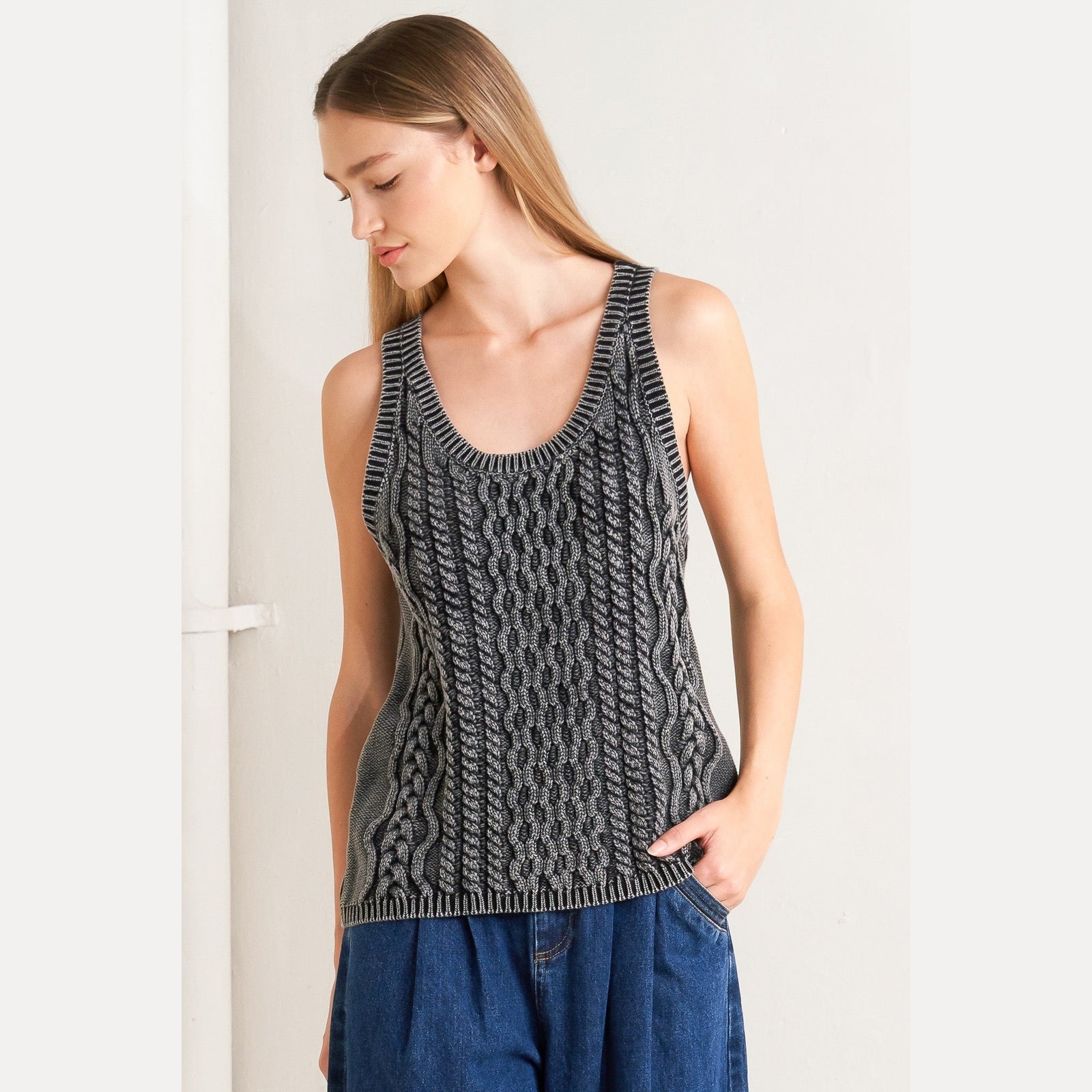 A washed sweater knit tank top featuring U neckline and sleeveless