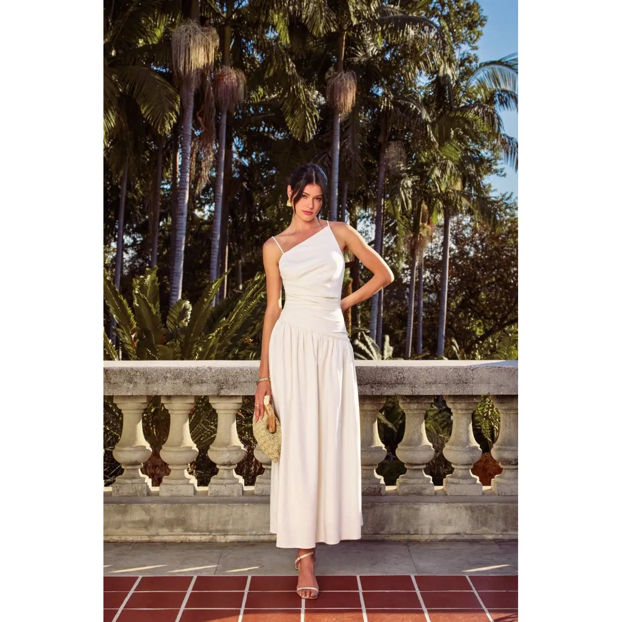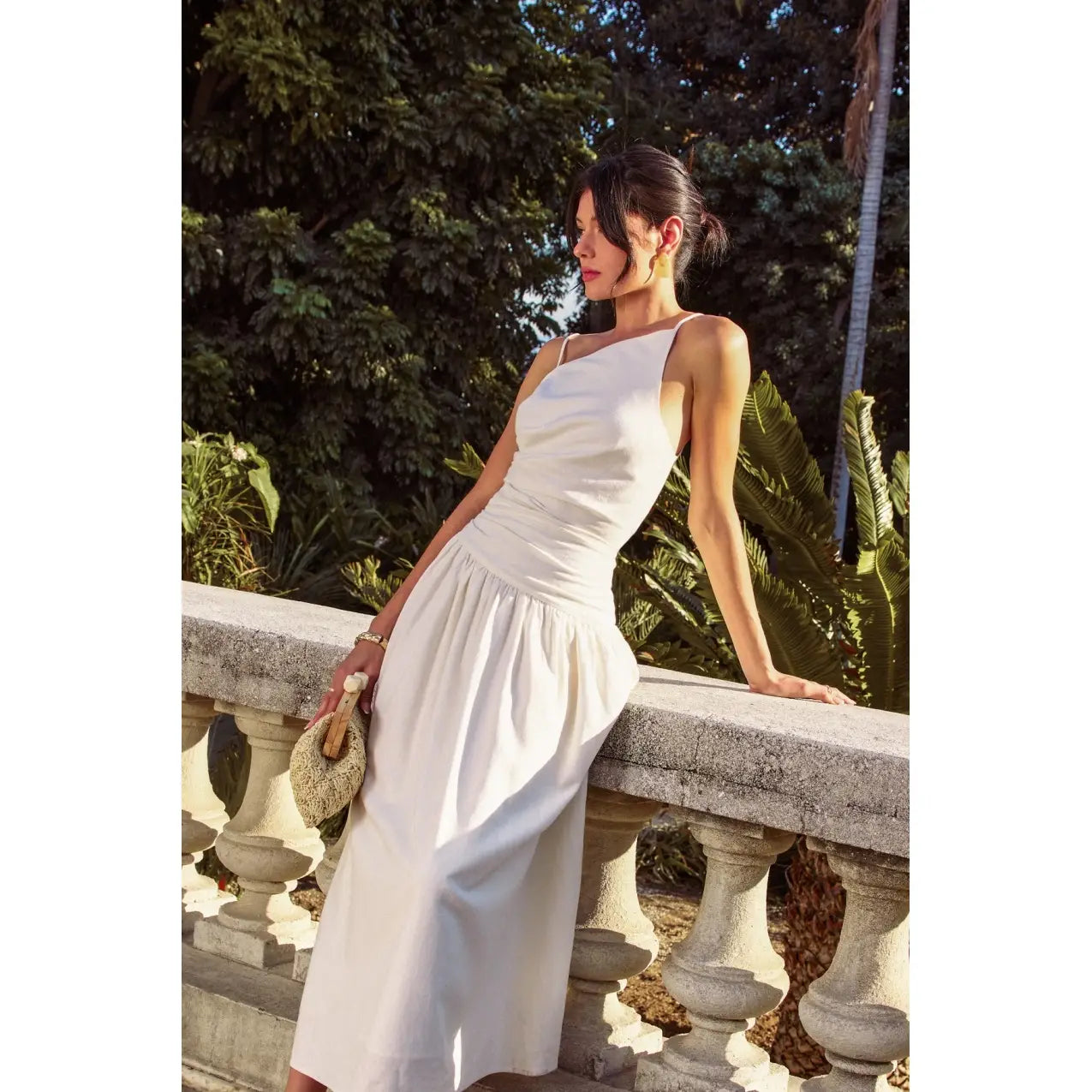 Cotton linen blend maxi dress featuring asymmetrical neckline and dropped waist.