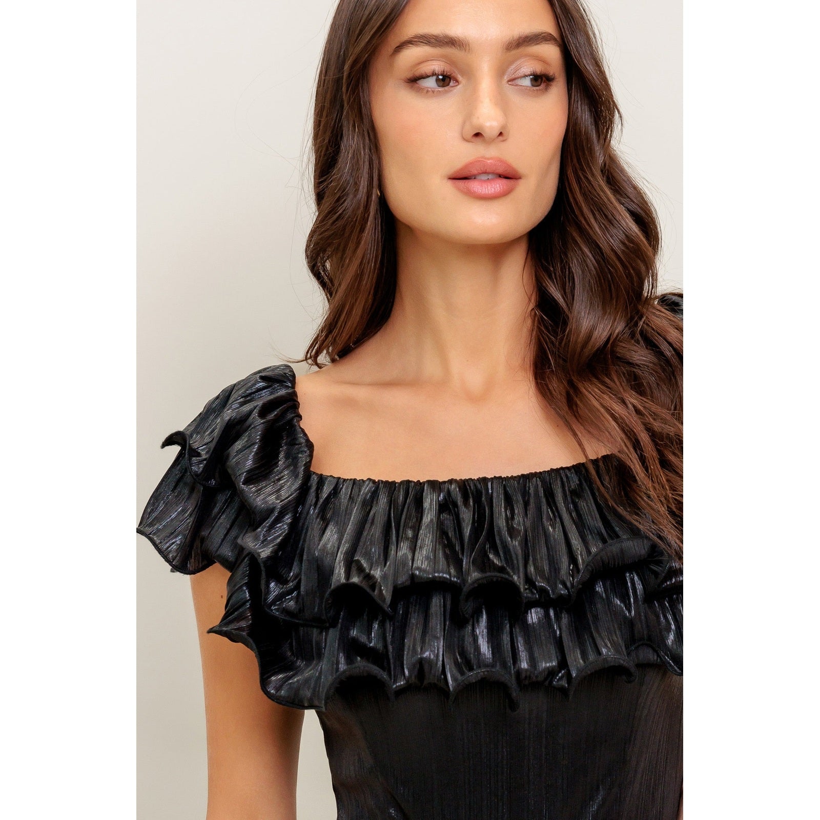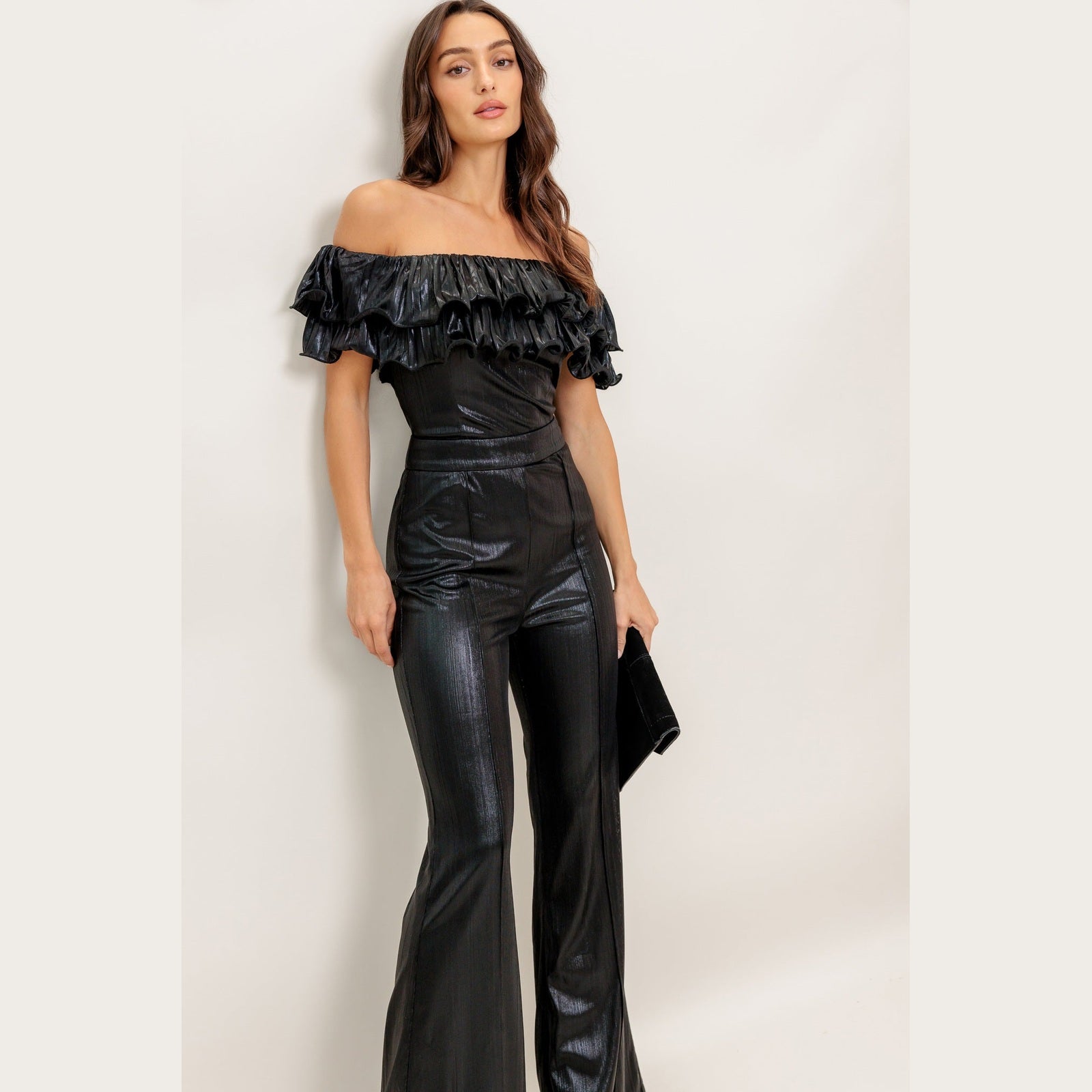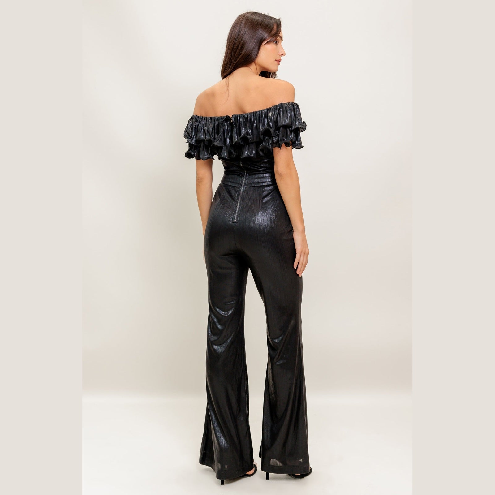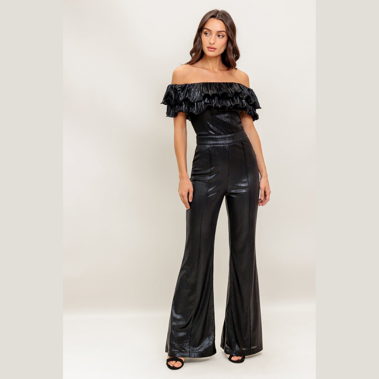 A coated woven jumpsuit featuring off shoulder neckline, double layer pleated flounce, flare leg and back zipper closure