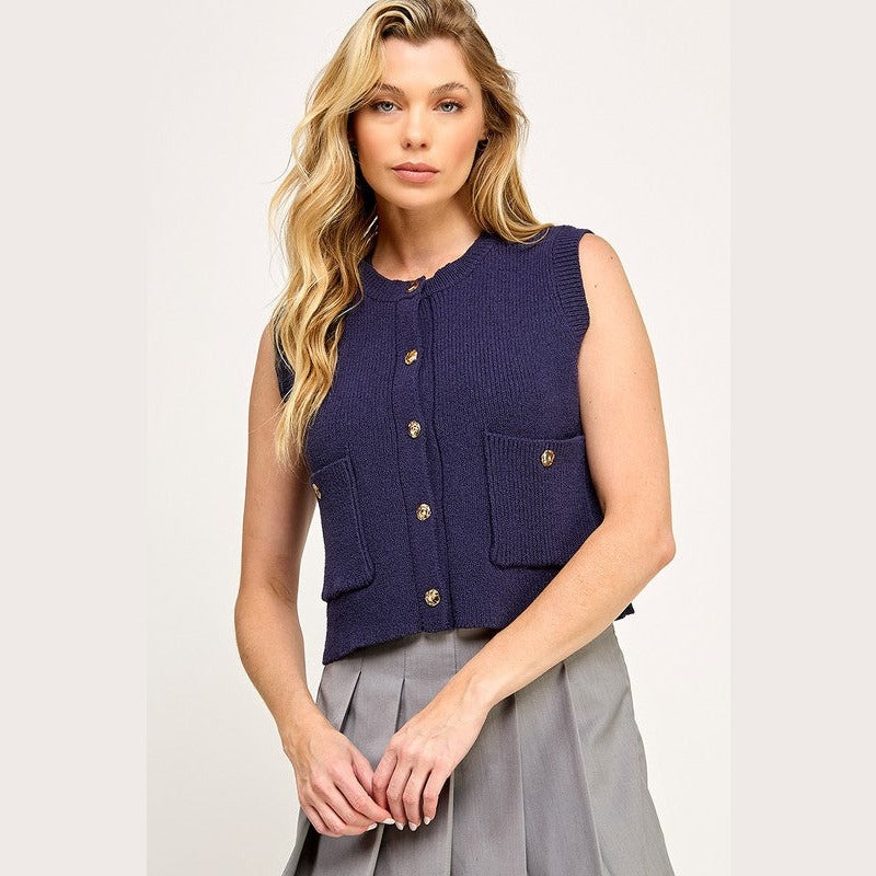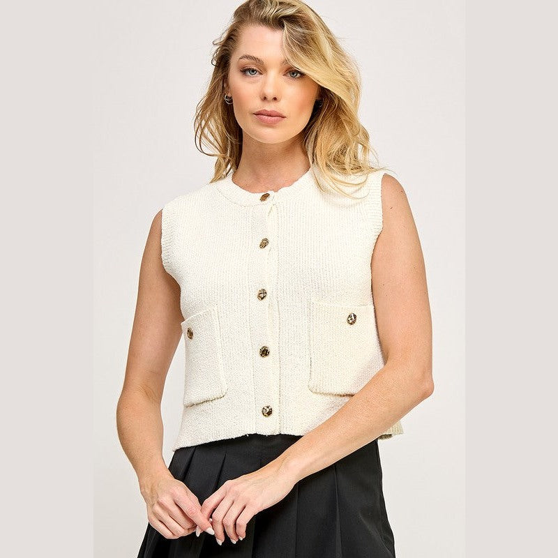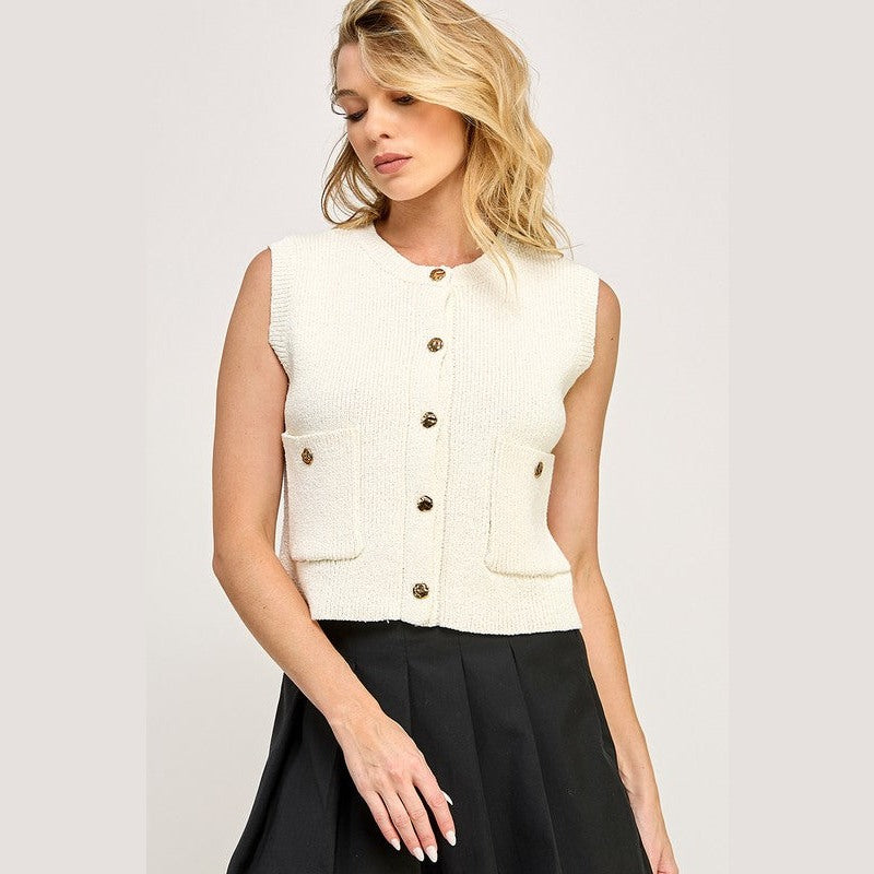 Button Down Waistcoat Sleeveless Sweater in Off White and Navy