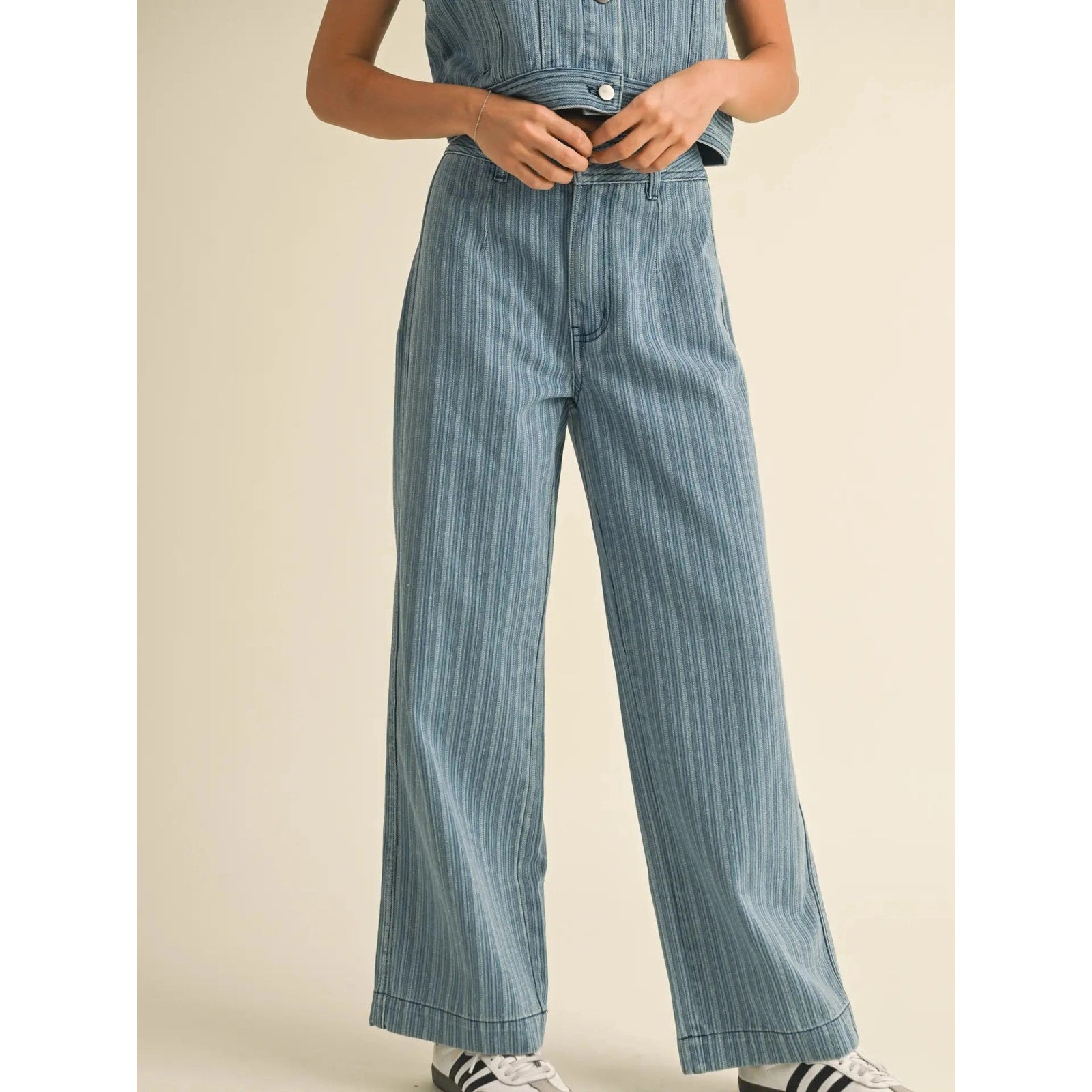 Perfect for a day out or a casual dinner, these pants will make you stand out while keeping you comfortable all day long. Pair with our matching striped denim jacket to complete the look!