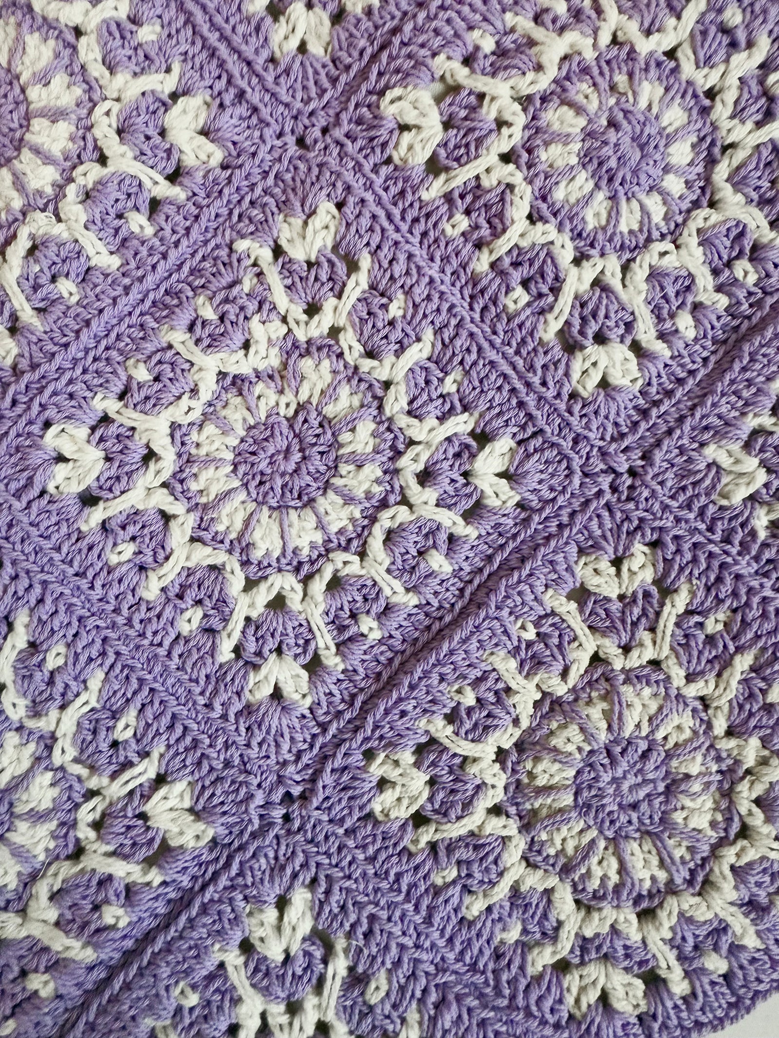 Beautiful hand knotted lavender and white macrame shoulder bag, zipper closure.