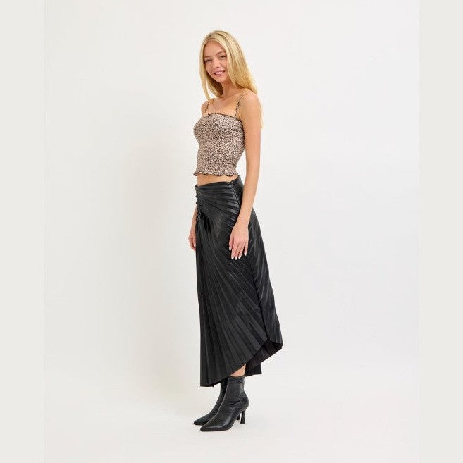 Vegan Leather Asymmetrical Skirt with Starburst Pleat Detail - Black